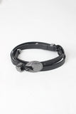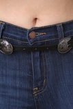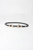 Double the buckle double the fun! This belt features vegan leather, etched metal hardware, round buckles, and adjustable closure.