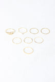 This set of eight rings features a variety of style of delicate, textured, a leaf design, and rhinestone rings on non-adjustable bands.