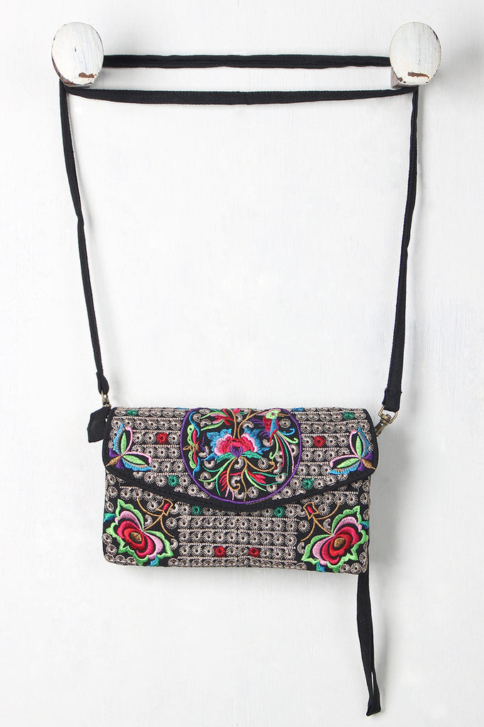 This small crossbody bag features a colorful embroidered floral design, full lining with four inner pockets, removable wrist strap and body strap. Finished with a magnetic snap flap closure with inner zipper closure.