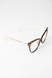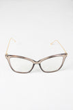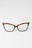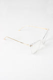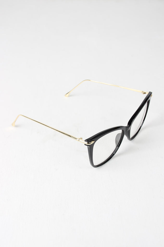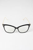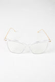 These sunglasses feature a plastic frame, slight cat eye shaped clear lenses and metallic wire arms that wrap slightly onto the front.
