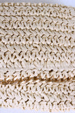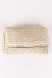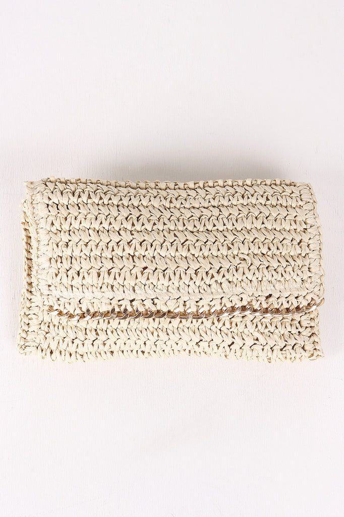 This cute clutch features a crochet paper straw design, rectangle pouch shape, fold over with a chain accent, top zipper closure, and full lining.