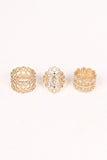 This ring set features a textured filigree design with cut out details, rhinestone accents, and a high polish finish on non-adjustable bands.