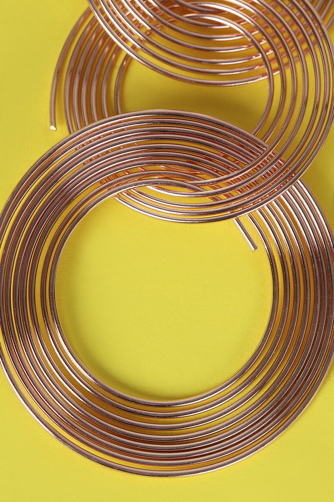 These drop earrings feature flat circle hoops interlocking linked to each other with push back closures.