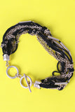 This bracelet features a textured bar accents, knotted design with thread/ link chains, and a toggle closure.