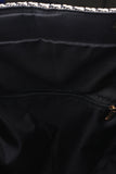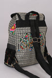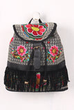 This bohemian inspired backpack features detailed embroidery floral design, contrasting canvas panel, vegan suede fringe, pull-drawstring at opening, buckle flap closure, and adjustable shoulder straps.