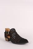 These edgy booties feature an almond toe, geometric-shaped cutouts, open side with buckle accents, and block stacked heel. Finished with a cushioned insole for comfort.