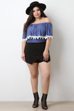 These plus size shorts feature a textured knit fabrication, elasticized high waist, and an asymmetrical overlap design. Accessories sold separately. Made in U.S.A. 96% Polyester, 4% Spandex.