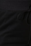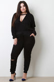 These plus size joggers feature a terry knit fabrication, distressed accents, high rise wide elasticized waistband with self-tie lace, two pockets, and cuffed hemline. Accessories sold separately. Made in U.S.A. 36% Cotton, 34% Rayon, 30% Polyester.