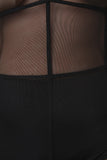 This plus size jumpsuit features a stretchy semi-sheer mesh fabrication, grid pattern, strappy bust, deep v-neckline, adjustable spaghetti straps, and taper cut legs. Briefs and accessories sold separately. 90% Polyester, 10% Spandex.