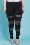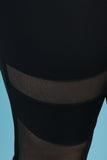 These plus size pants feature a solid stretchy knit with semi-sheer mesh inset design, elasticized mid rise waist, and taper cut legs. Accessories sold separately. Self: 95% Polyester, 5% Spandex. Contrast: 91% Polyester, 9% Spandex