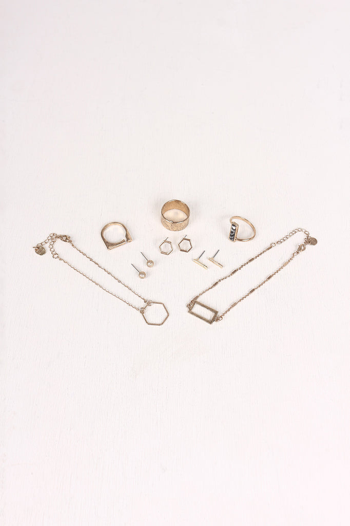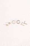 This earrings , one with an open hexagon design, textured ball studs, and bar designed earrings. All with push back closures.