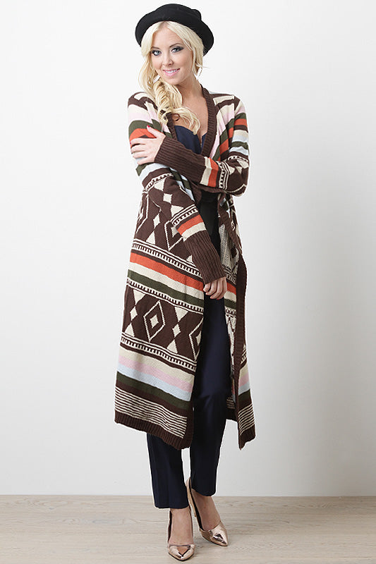 Prepare for fall and winter fashion in this Deserted Trail Cardigan. Featuring soft woven fabrication, tribal and striped print throughout, asymmetrical hem, and flap opening. Accessories sold separately. 100% Acrylic.