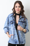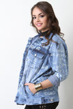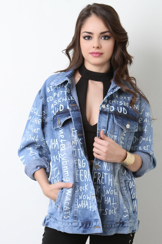 This unique denim jacket features an oversized design, button-up front, collar neckline, front pockets, long sleeves with single-button cuffs, and finished with random letter designs. Accessory sold separately. 100% Cotton.