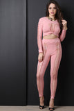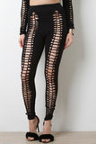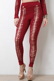 These sexy jersey knit leggings feature an elasticized waistband, high waisted, stretchy sculpture fit, taper cut legs and a braided cutout constructed front. Accessories sold separately. Made in U.S.A. 94% Cotton, 6% Spandex.