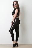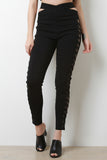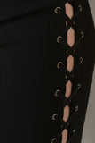 These high waisted pants feature a stretchy knit, cutout design at waist, decorative grommets with corseting lace-up design on sides, taper cut legs and exposed back zipper closure. Accessories sold separately. 65% Rayon, 30% Nylon, 5% Spandex.
