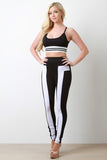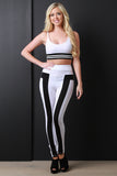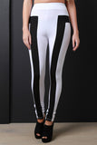 These pants feature textured stretch fabric, two-tone design, high waist, and taper cut legs. Accessories sold separately. Made in USA. 95% Polyester, 5% Spandex.
