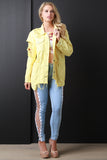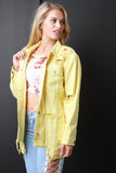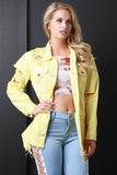 This jean jacket features a button up front, collar neckline, long sleeves, distress details throughout, flap breast pockets, side pockets, and a square raw hem. Accessories sold separately. 100% Cotton.