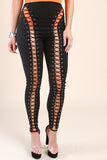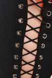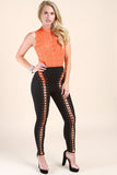 These pants features a corset lace-up front, eyelet hardware, taper cut legs, and zipper back. Accessory sold separately. 65% Rayon, 30% Nylon, 5% Spandex.