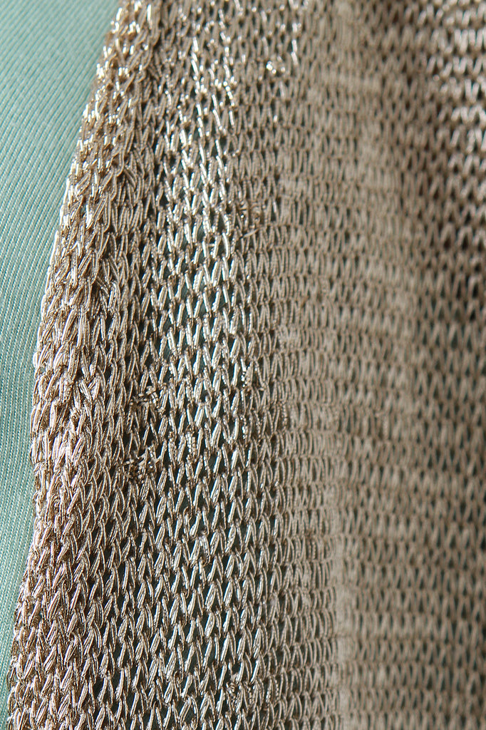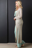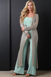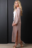 This cardigan features a metallic knit design, open front, long sleeves, side vent slits, and duster length hemline. Accessory sold separately. 77% Viscose, 23% Metallic.