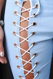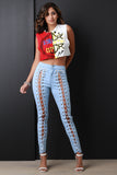These skinny lace-up detailing, silver-tone eyelets, high waisted, zipper fly, single button closure, and two back pockets. Accessory sold separately. 95% Cotton, 5% Spandex.