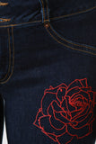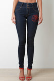 These skinny jeans feature a high waist design, 3-buttons closure, zipper fly, belt loops, front faux pockets, and an embroidery rose detail. Accessories sold separately. 72% Cotton, 15% Rayon, 12% Polyester, 1% Lyrca.