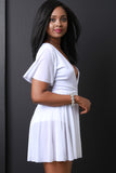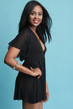 This romper features a skater inspired cut, deep v-neckline, short flutter sleeves, cinched empire waist seam, open back with a single button closure at nape, hot shorts underlay, and semi-sheer mesh flare shorts overlay. Accessory sold separately. Made in U.S.A. 50% Rayon, 50% Polyester.