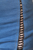 These denim shorts features a stretchy sculpture fit, high waisted, side cutout with vegan leather lattice cage design, and zipper back. Accessory sold separately. 80% Cotton, 18% Polyester, 2% Spandex.