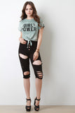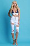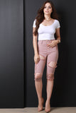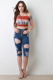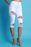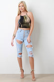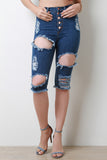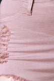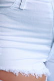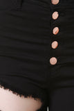 These denim shorts feature distressed accents, high rise waist, belt loops, two back pockets, five button closures, and fringe hemline. Accessories sold separately. Made in U.S.A. 73% Cotton, 14% Rayon, 11% Polyester, 2% Spandex.