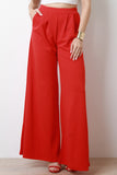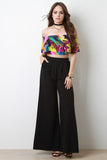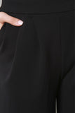 These pants feature elasticized high waist, pleated detail, two side pockets, and wide flared legs. Accessories sold separately. Made in USA. 95% Polyester, 5% Spandex.