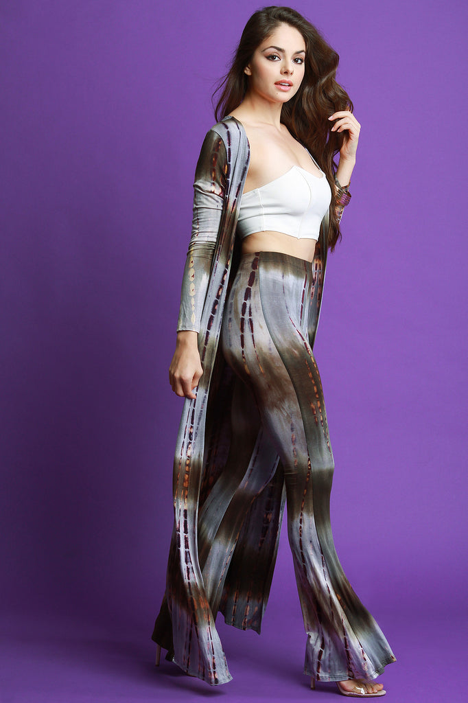 This cardigan features soft jersey knit, tie dye print, open front, long sleeves, and maxi length. Accessories sold separately. Made in USA. 95% Rayon, 5% Spandex.