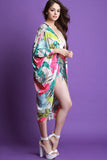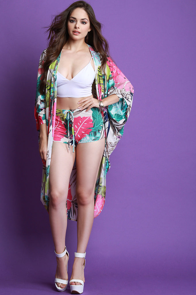This two piece set features monstera leaf pattern print, longline cardigan cover-up, open front, quarter-length dolman sleeves, and matching shorts. Accessory sold separately. Made in U.S.A. 95% Polyester, 5% Spandex.
