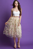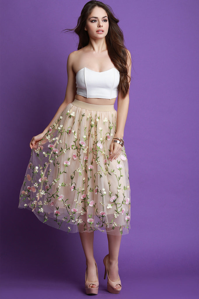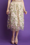 This lovely A-line skirt features a semi-sheer tulle fabrication, floral embroidered mesh overlay, wide elasticized waist, and lined. Accessories sold separately. 100% Polyester.