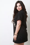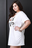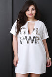 This plus size dress features a french terry knit, "Grl Pwr" printed at front in metallic foil design, round neckline, keyhole yoke cutout, short folded sleeves, shift dress silhouette, and a mini length hemline. Accessories sold separately, Made in U.S.A. 10% Rayon, 86% Polyester, 4% Spandex.