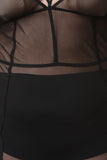 This plus size dress features semi-sheer mesh fabrication, grid pattern, strappy bust, deep v-neckline, adjustable spaghetti straps, and a midi length hemline. Briefs and accessories sold separately. 90% Polyester, 10% Spandex.