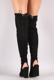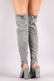 These over the knee boots feature a soft vegan suede, chunky wrapped heel, peep toe silhouette, open back, and a drawstring collar that ties at the back for custom fit. Pull on construction with partial side zip closure.