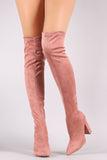 These over-the-knee boots feature a slightly stretched vegan suede, covered block heel, pointed toe, and easy pull-on construction. Cushioned insole for comfort.