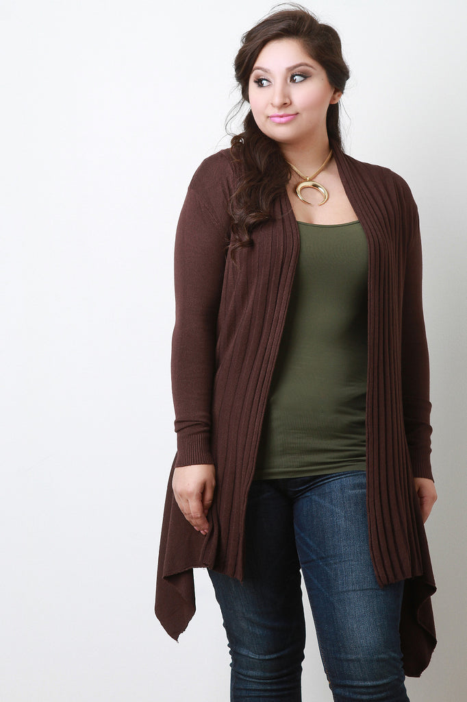 This plus size cardigan is long sleeves, trapeze hem bodice. Designed with a ribbed open front, featuring, a self tie sash. Accessories sold separately. 100% Polyester.