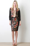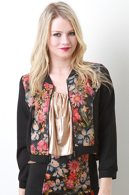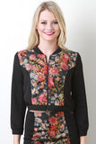 Matching jacket featuring floral print leatherette front detail with stretchy knit throughout, long sleeves, round neck, and zipper closure. Accessories sold separately. Shell 1: 50% Polyurethane, 50% Rayon. Shell 2: 94% Polyester, 6% Spandex. Lining: 100% Polyester.