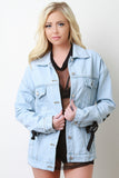 This denim jean jacket features a button up front, collar neckline, long sleeves, eyelet ribbon lace-up detailing, flap breast pockets, and side pockets. Accessories sold separately. 100% Cotton.