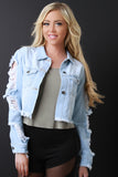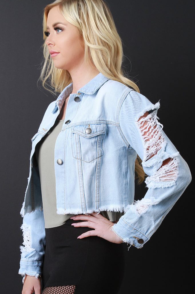 This denim jacket features a button-up front, collar neckline, flap breast pockets, long distressed slit sleeves, and a fringed cropped hemline. Accessory sold separately. 100% Cotton.