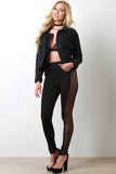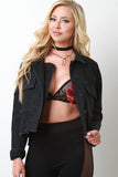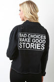 This denim jean jacket features a classic collar neckline, button-up front with hidden flap, double breast pockets, long sleeves with button-tab hem, fringe asymmetrical hemline, and Bad Choices Make Good Stories screen print at back. Accessory sold separately. 100% Cotton.