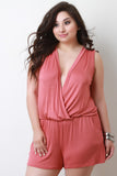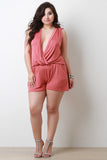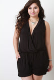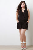 This sleeveless jersey romper features a surplice front, elastic waist, and side pockets. Unlined. Accessories sold separately. Made in U.S.A. 95% Rayon, 5% Spandex.