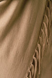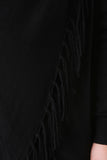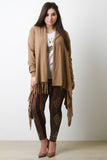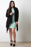 This plus size longline cardigan features a draping cowl neck design when buttoned up and a handkerchief shape when worn open. Finished with long sleeves and one-sided fringe trim. Accessories sold separately. 50% Viscose, 50% Nylon.