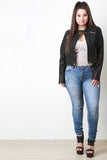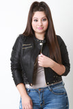 This plus size jacket is moto style, featuring, decor zippers at upper front and braided side accents. Full functional front opening zipper, snap buttons, and buckle strap. Partial lining. Vegan leather. 50% Polyester. 50% Poliuretano.