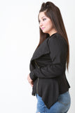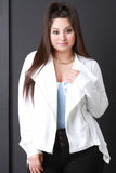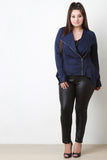 This plus size blazer jacket features a textured knit fabrication, draped lapels, long sleeves with button cuff, and zip-up closure. Finished with a handkerchief hemline. Accessories sold separately. Made in U.S.A. 75% Polyester, 20% Rayon, 5% Spandex.