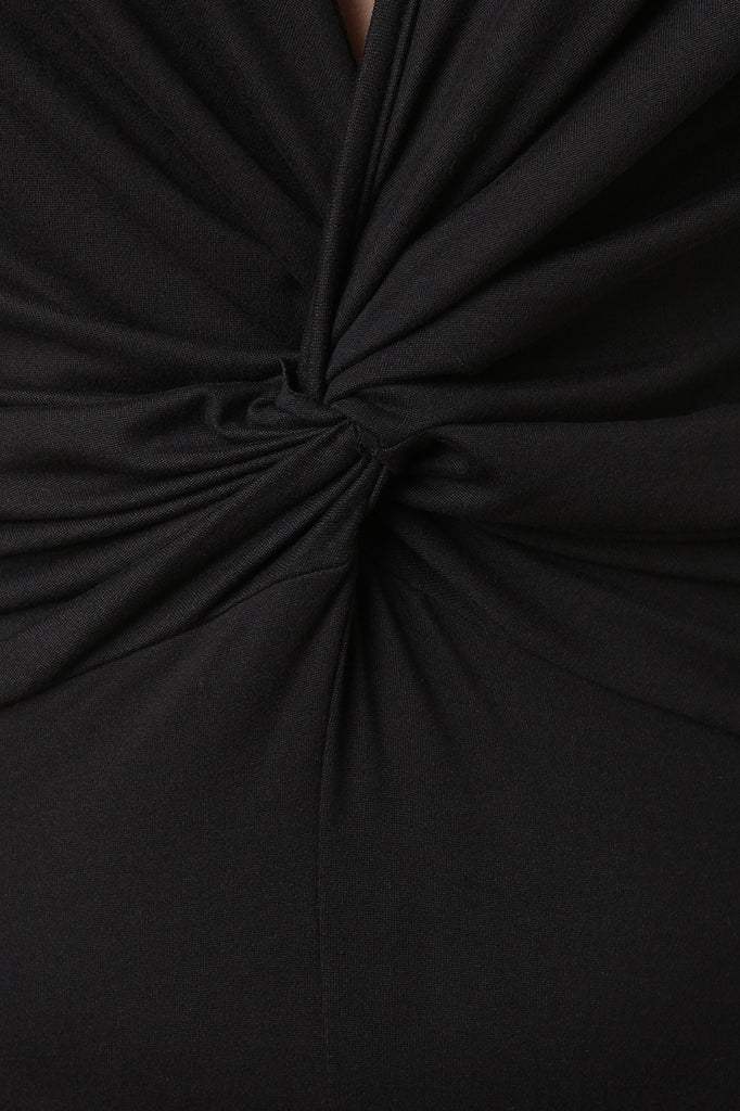 This sexy plus size jumpsuit features a smooth knit fabrication, plunging v-neckline, long sleeves, knotted front design, and finished with taper cut legs. Accessories sold separately. Made in U.S.A. 95% Polyester, 5% Spandex.