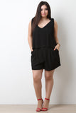 This plus size romper features textured fabrication, a flowy top tier, v-neckline, self-tie shoulder straps, and split back with button closure. Finished with an elasticized waistline, loose fit shorts with pockets, and a back zipper closure. Accessories sold separately. 100% Polyester.