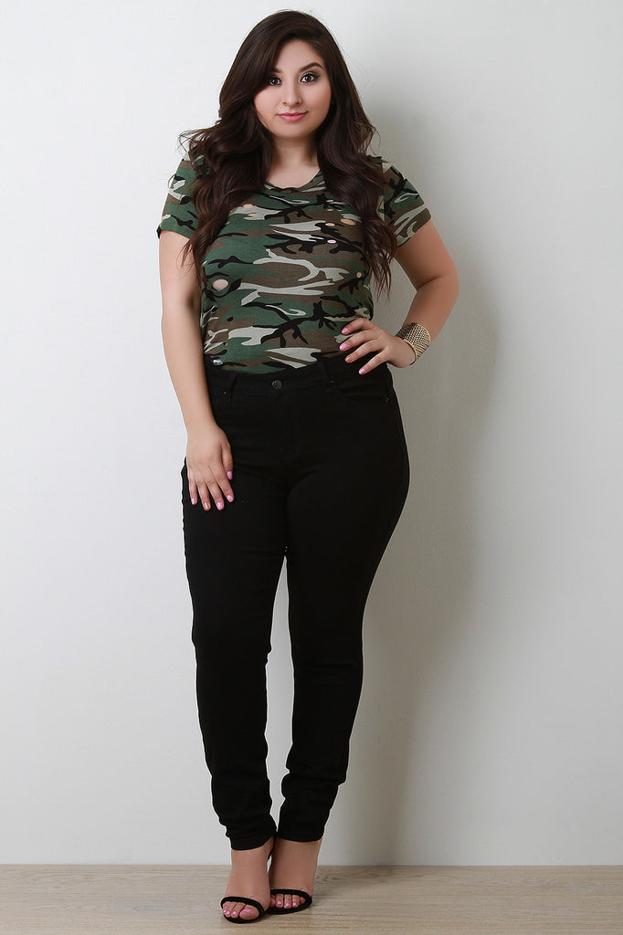 These plus size jeans feature a stretchy sculpture, skinny cut legs, slight high rise waist, classic 5-pockets, zipper fly, and a single button closure. 65% Cotton, 25% Polyester, 8% Rayon, 2% Spandex.