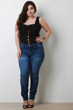 These plus size jeans feature a medium wash, stretchy sculpture, skinny cut legs, slight high rise waist, classic 5-pockets, zipper fly, a single button closure, and a raw cut hem. 65% Cotton, 25% Polyester, 8% Rayon, 2% Spandex.