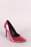 This classic pump features a pointy toe silhouette, mirror shine design, single sole, and wrapped stiletto heel. Finished with a lightly padded insole and easy slide style.